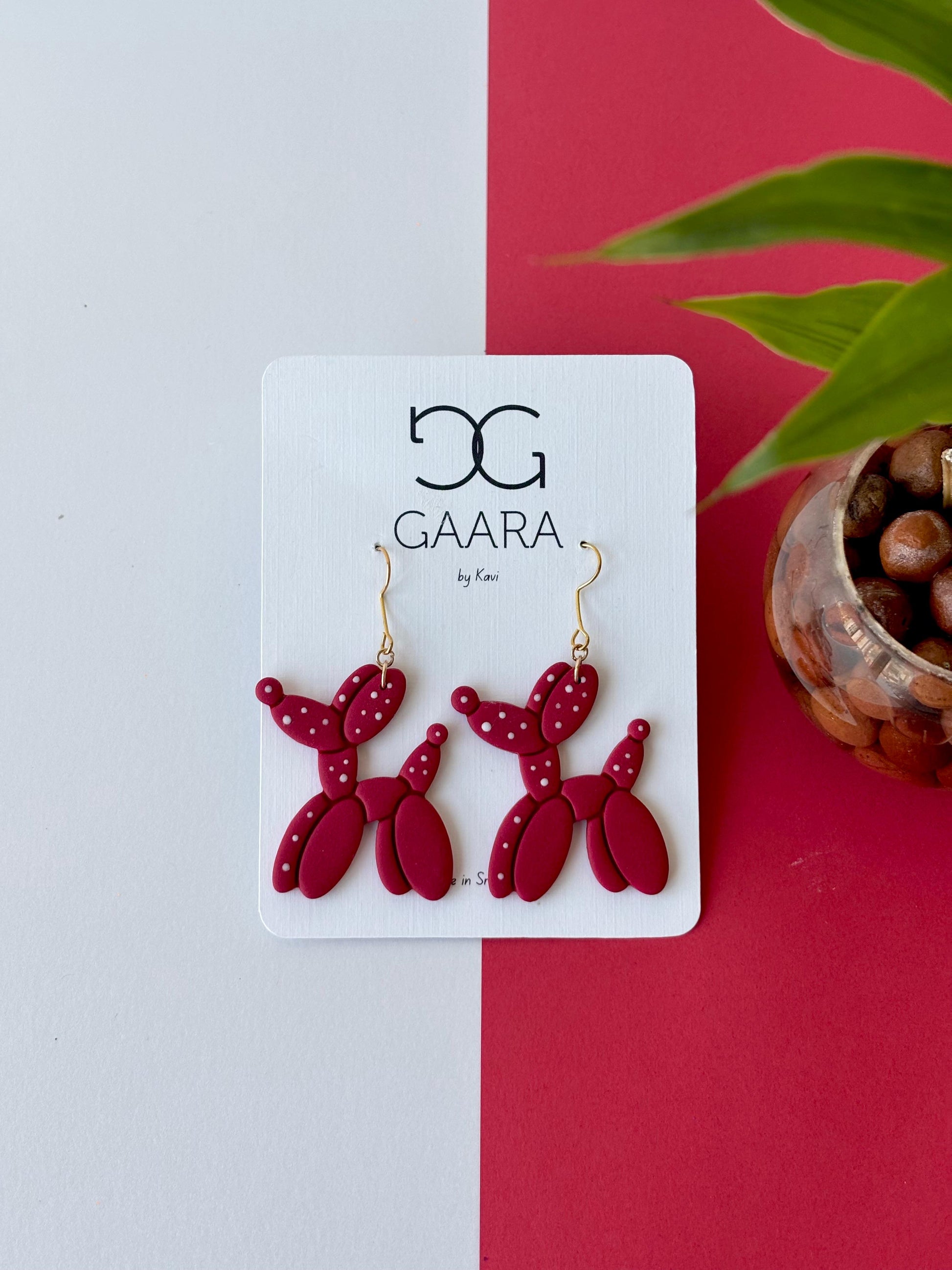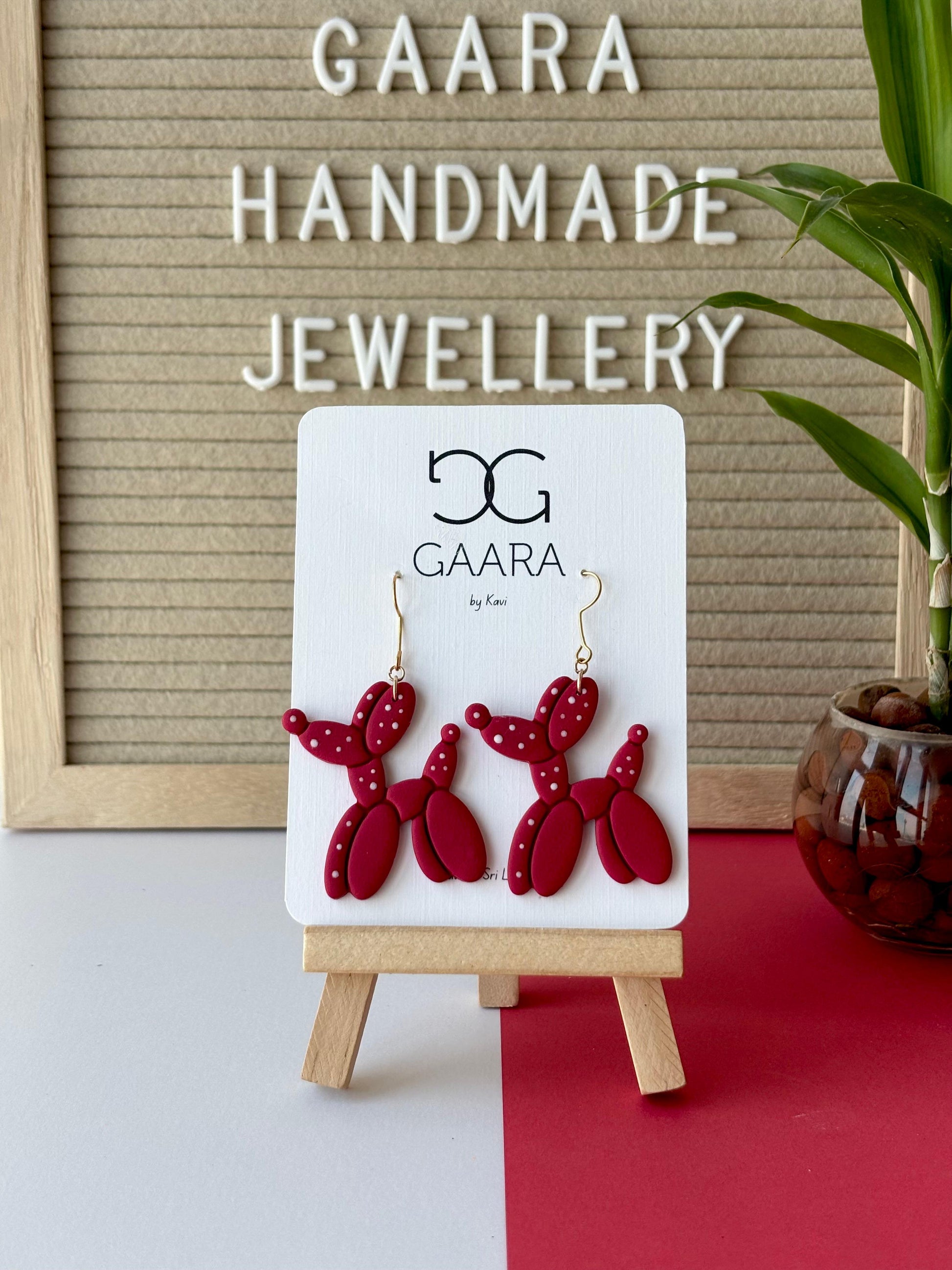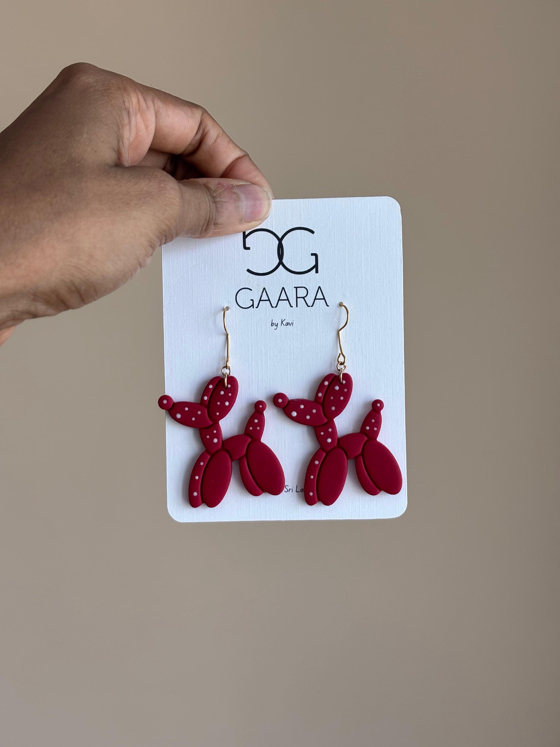 Puppy Love is a playful heart-balloon design featuring deep crimson tones with dotted details, this charming pair adds a fun yet elegant touch to your Valentine’s look.
