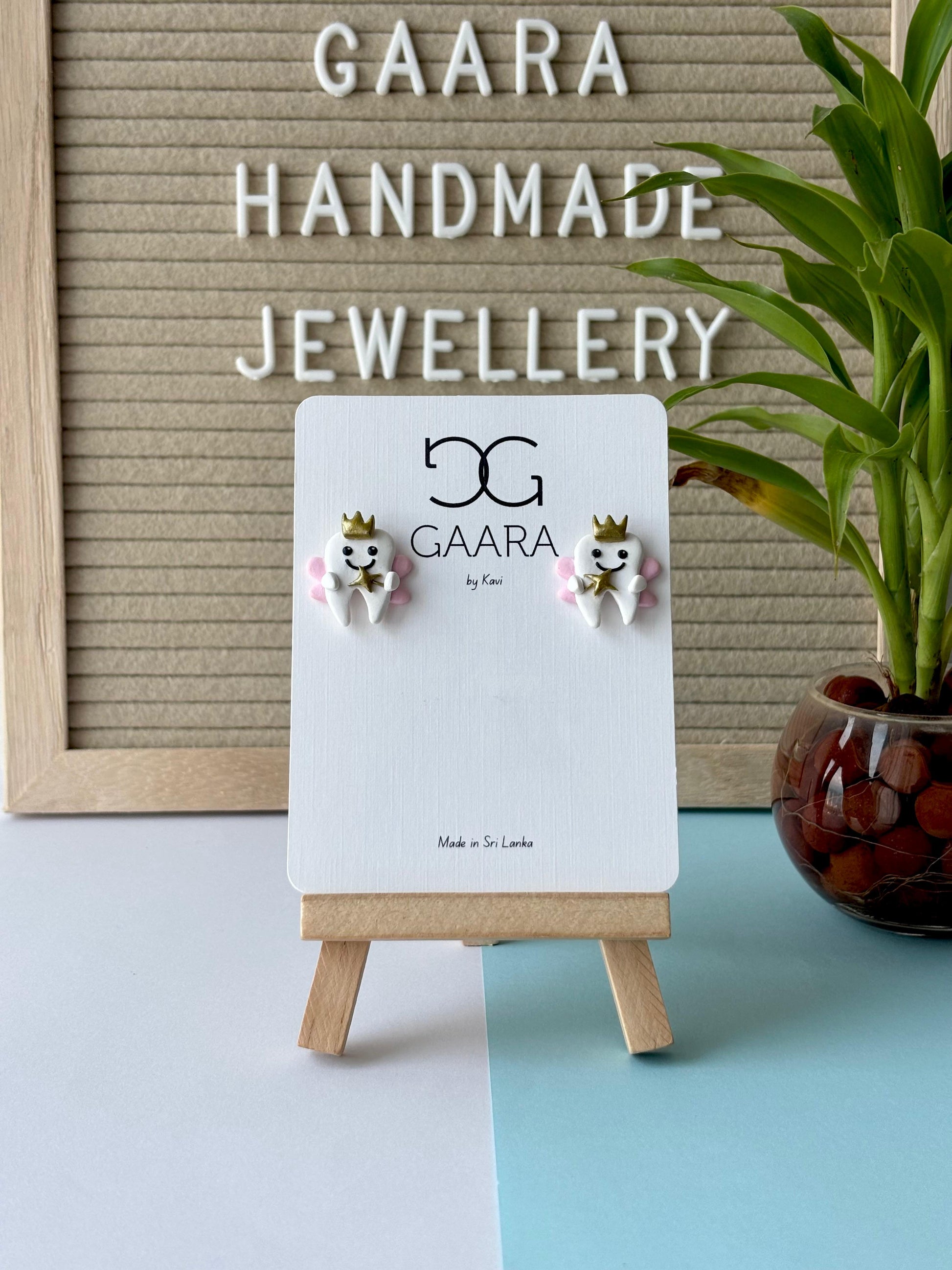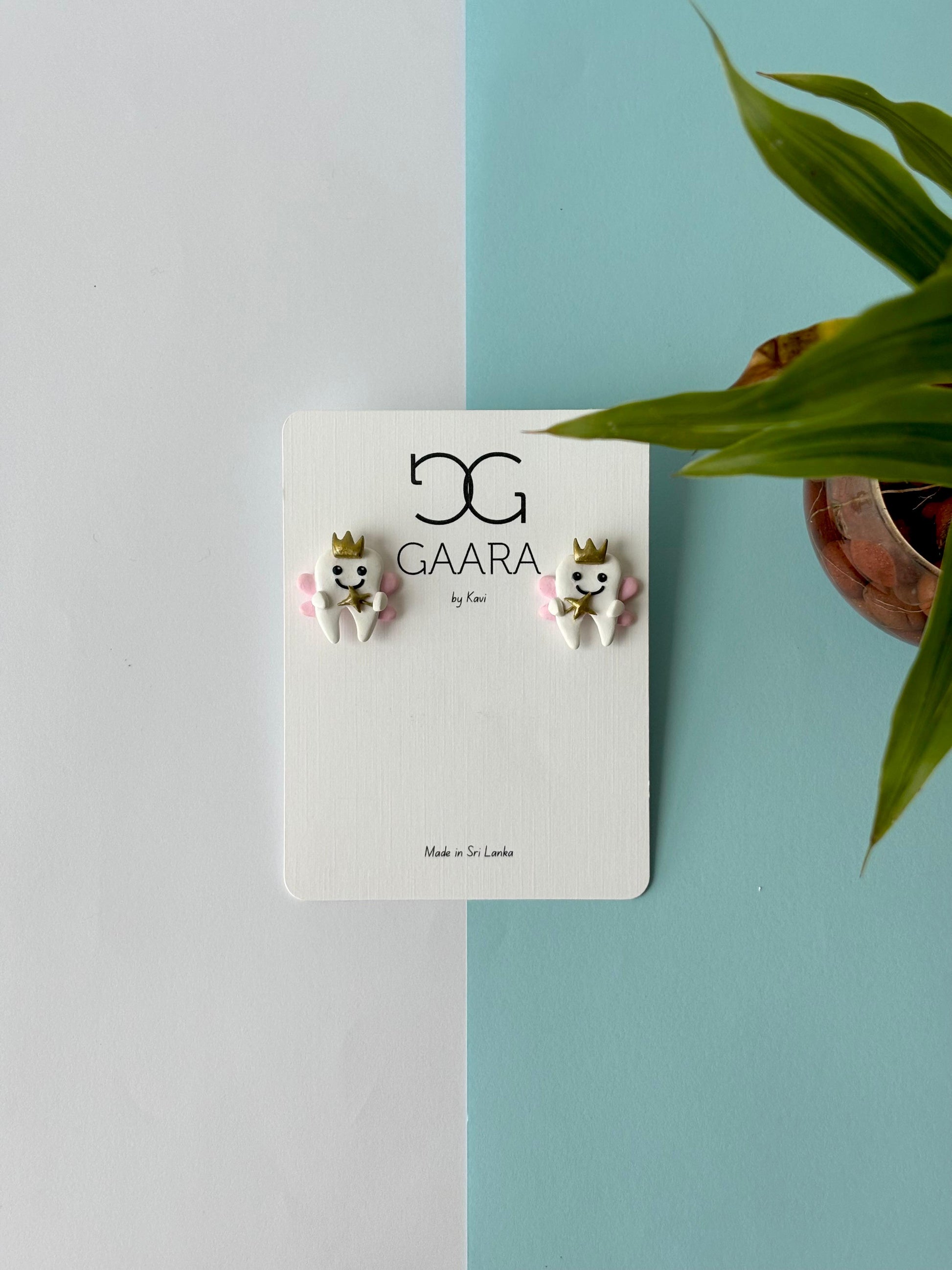 Inspired by childhood magic, these adorable stud earrings feature smiling crowned teeth with tiny fairy wings — perfect for little smiles and big imaginations.